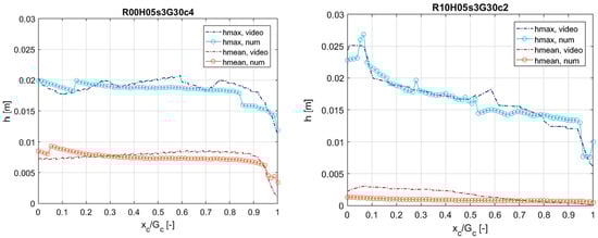 The comparison among the envelopes is qualitatively given in Figure 7 for two tests (R00H05s3G30c4 and R10H05s3G30c2) selected from the dataset of validation (see Table 4) and presenting different crest freeboards (R00 and R10) and slopes (c4 and c2). In both cases, the numerical envelopes follow the trends from the videography, showing the same decrease rates and very similar values of the maximum and mean h at the extremes of the dike crest. To assess the level of agreement between the corresponding envelopes, the maximum reciprocal distances can be considered: ~2 mm for the maximum envelopes of both the tests, and respectively ~0.5 mm and ~1 mm for the mean envelopes of test R00H05s3G30c4 and test R10H05s3G30c2. These tests are representative of the whole dataset, and the same accuracy was achieved for all the 12 tests.