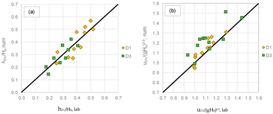 For each test, Table 4 reports the values of the hydraulic parameters (Hm0, Tm−1,0 and ξm−1,0) measured in the laboratory (column “Lab”) and derived from the numerical model (column “Num”), including the dimensionless average values of q, q/(gHm0Tm−1,0) and the values of Kr. For each parameter, the mean μ and the standard deviation σ representative of the distribution of the ratio between numerical and experimental values (num/lab) are provided. Overall, the values of μ(num/lab) related to Hm0, Tm−1,0 and ξm−1,0, which are respectively equal to 0.87, 1.02 and 1.11, suggest that the code well reproduces the target wave conditions. The agreement between numerical and laboratory wave periods is remarkable (μ = 1.02, with σ = 8.4%), while the wave heights were slightly underestimated in the numerical code (μ = 0.87, σ = 8.0%). This result is line with the tendency of the IH-2VOF code to reduce the wave steepness by generating lower wave heights with respect to the target values, especially when the waves are generated in intermediate depth water (see, all of [15,16]), as in the present case. The lower values of sm−1,0 obtained with the numerical code determined, in turn, slightly higher values of ξm−1,0 (μ = 1.11, σ = 9.75%); i.e., wave conditions slightly more distant from the wave breaking.