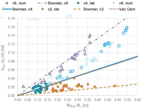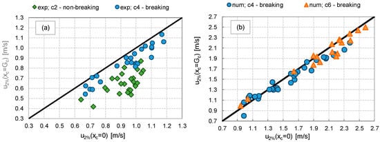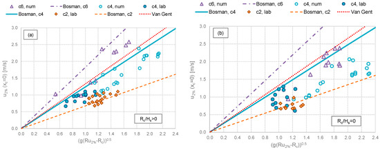 The different trends of u associated to the different breaker types affect the value of u2% at xc = Gc, which in the practice represents one of the most relevant parameters, as it governs the down-wash streaming in the inland area. Figure 19 compares the values of u2%(xc = Gc) to the corresponding values of u2%(xc = 0) obtained from the experimental (Figure 19a) and numerical tests (Figure 19b) for the different breaking or non-breaking conditions. All the numerical tests (at Rc/Hs ≥ 0) represent waves reaching the dike crest in breaking (cotαoff = 4) or broken (cotαoff = 6) conditions, while the experimental tests present both non-breaking (cotαoff = 2) and breaking (cotαoff = 4) wave conditions.