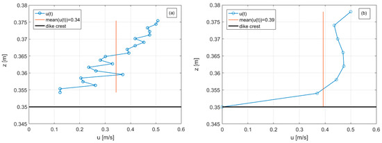 One of the main points raised by Guo et al. [17] to justify the different trends of u along the dike crest with respect to Equation (8) regards the different dynamics of propagation of the breaking and non-breaking waves over the dike crest. When the wave reaches the dike crest in breaking or fully-broken conditions (see Figure 15), it has already dissipated most of its energy, and the flow over the dike crest is highly turbulent and is characterized by a large amount of air pockets entrapped in the water tongue. The air entrainment may induce significant differences between the results of physical, numerical and theoretical modelling due to the different approaches for the assessment of the flow velocity. In the laboratory, the UVPs provide measurements of the instantaneous vertical profiles of u, which can be severely affected by the presence of air pockets in the water column as the sonic impulse of the UVP is interrupted when travelling across air. The numerical code can calculate the u-values of the water phase exclusively, neglecting the air-phase, leading, therefore, to potential over-estimation of the u-values. Finally, Schüttrumpf and Oumeraci [7] considered a steady-flow boundary layer and flow-depth averaged velocities, hence evaluating the maximum u-values at the free surface. It is evident that these assumptions hold no more in case of broken waves in turbulent flow, where the maximum u is found close to the dike surface.