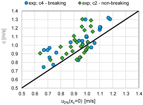 From Figure 19 it is evident that u2% effectively decays from xc = 0 to xc = Gc only in case of c2; i.e., of non-breaking waves (green diamonds). The average decay was of approximately the 30%, ranging between 13% and 45%. The variability of the decay rate was due to the different combinations of crest widths, freeboard conditions, wave steepness and wave heights. However, no explicit or systematic relationship was found between the decay rate and any of the parameters Gc, Rc/Hs, Hs/Lm−1,0 and Hs. The absence of a direct link between the decay rate and Gc can be explained with the small friction determined by the smooth dike surface and by the limited value of Gc. This result is in agreement with the synthesis by EurOtop [13,28], where a specific indication of negligible decay for flow depths larger than 0.1 m and Gc around 2–3 m is reported.