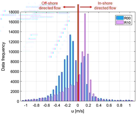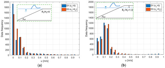 Frequency distribution of the instantaneous depth-averaged values of u at the dike off-shore (blu) and in-shore (orange) edges for the same experimental test (H05s3G30c4) at Rc/Hs = 0 (panel (a)) and Rc/Hs > 0 (panel (b)).