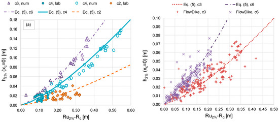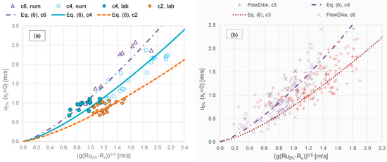 Equations (5) and (6) were calibrated on numerical and experimental data for modest wave run-up values corresponding to the typical working conditions of the coastal defense structures ((Ru,2% − Rc)/Hs < 2). Higher run-up heights were also modelled with the numerical code to analyze more severe or catastrophic scenarios ((Ru,2% − Rc)/Hs > 2–2.5) in a climate change situation. The validity of Equations (5) and (6) were checked against the two sets of experiments, FlowDike1 and FlowDike2 [39,40], on dikes with cot(αoff) = 3 and 6. The new formulae are characterized by at least the same accuracy of the existing methods when applied to FlowDike1 and FlowDike2, while they provide a remarkably better representation of the new experimental and numerical data.