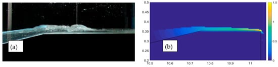 Figure 18a,b also shows the presence of air pockets entrapped in the water tongue, especially in the area beneath the surging breaker immediately preceding the impinging section. The air entrainment is still thought to be a concurrent cause of the discrepancies between numerical and experimental results and the theoretical approach by Schüttrumpf and Oumeraci [7], as already identified by Guo et al. [17].