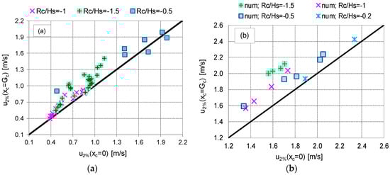 In many cases, the water layer above the dike crest prevents the wave from breaking at all. For this reason, the effect of the wave breaking presented and discussed for Rc/Hs ≥ 0 no longer applies. On the contrary, a sharp effect of Rc/Hs was observed, as the increased rate of u2% increased with the crest submergence. Such an effect was already evident from the average trends of Figure 16b and is displayed by Figure 21, which compares the numerical values of u2%(xc = 0) with the corresponding values u2%(xc = Gc) for all the available numerical tests at Rc < 0 in wet (panel a) and dry (panel b) landward conditions. In that figure, the data are clustered on different levels above the bisector line according to the values of Rc/Hs: the lower the value of Rc/Hs, the farther the data from the bisector; i.e., the lower the Rc/Hs, the larger the ratio u2%(xc = Gc)/u2%(xc = 0). On average, the values of u2%(xc = Gc)/u2%(xc = 0) ranged from 5% to 30% for Rc/Hs ranging from −0.2 to −1.5 in dry landward conditions. Similar results were observed for the wet landward conditions, though the increase of u2% from xc = 0 to xc = Gc seemed to be more modest (up to 20%–25%) and not sharply related to Rc/Hs. This was probably due to the presence of the water on the landward side, which determines lower hydraulic gradients between the off-shore and in-shore edges, and consequently, more modest flow acceleration.