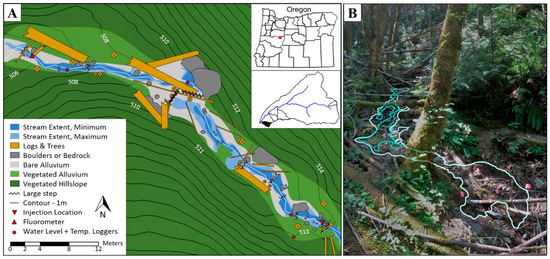For this study, we established an experimental reach within WS01 of about 60 m in length. Pressure transducers (U20L-04 model, Onset) measured stream stage at three locations within the study reach at 15-min intervals (see additional details in related publications [5,53]). The study reach was selected to include a reach that would be spatially intermittent during the entire study period, ensuring that all stream water and solutes would turnover through the hyporheic zone. The site includes a large gravel wedge and step through which 100% of streamflow is transported through the subsurface. Vegetation in the basin is primarily red alder in the valley bottom, with stands of Douglas fir of varied ages and shrubs on the hillslopes [24]. Stream discharge varied due to evapotranspiration in the basin [5,22,23,24,95,103,104,105,106,107,108], but contiguous surface flow along the reach was never observed (i.e., the reach was spatially intermittent for the entire study period). We monitored the maximum and minimum extent of surface water during the study, flagging the most expansive and contracted conditions within the study reach and mapping their positions with a topographic survey (Figure 1).