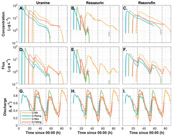 Time series of concentration (panels A–C), mass flux (panels D–F), and discharge (panels G–I) for all experiments, and all tracers including Uranine (conservative; panels A, D, E), Resazurin (parent compound; panel B, E, H), and Resorufin (daughter product; panels C, F, I). The dashed vertical lines indicate the time of lowest discharge.