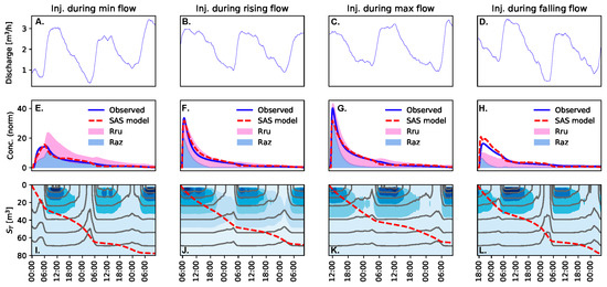 Time-series of discharge (panels A–D), observed and simulated concentration normalized by input mass (panels E–H), and density of the SAS function (panels I–L; darker color indicates higher probability). A vertical section along the bottom row can be interpreted as a probability density function of the age-ranked storage being exported from the study reach at any given time step.