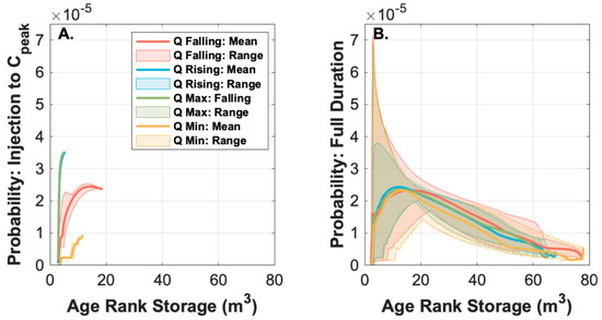 (A) Mean and range of SAS functions between tracer injection and the first diurnal peak in discharge after each injection. Note that the solute tracer injected at minimum discharge is too young to be exported prior to peak discharge, compared to all other injections which are biased toward export of the youngest age-ranked storage. (B) The full range of and overall mean SAS function for each injection. Time-variable SAS functions are displayed in the supplemental animation, showing how early-time disparities converge over the course of the entire time series.