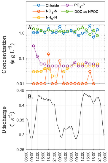 (A) Time series of nutrients and anions in the stream during diurnal fluctuations; (B) discharge during data collection.