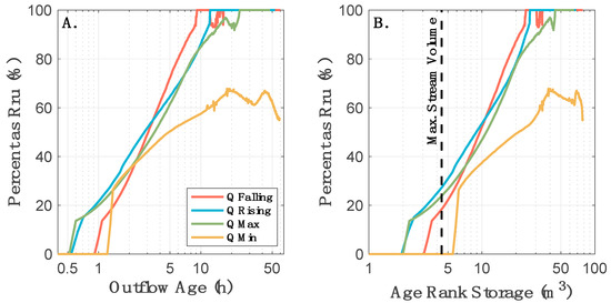 Fraction of outflowing Raz that has been transformed to Rru as a function of (A) outflow age, and (B) age-ranked storage in the study reach.