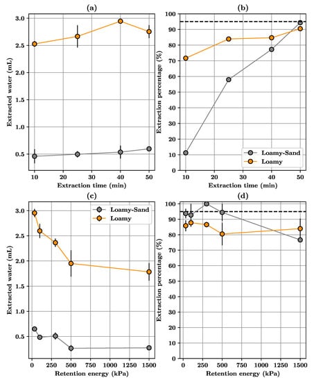 Regarding the differences between clay-dominated and sand-dominated soils, Orlowski et al. [] tested 6 extraction times (15, 30, 45, 60, 120 and 180 min) as clay soils can show problems due to pore water that could be weakly bounded to the soil. However, Orlowski et al. [] showed that there are no significant differences on the stable isotopic ratio due to extraction time. Based on Orlowski et al. [], we set the extraction time limit to 50 min. Our results showed that 50 min suffice to recover more than 0.1 mL at the most restrictive conditions, i.e., low water content in the soil sample corresponding to very dry site conditions. Extraction times to recover more than 90% of water on the soil sample water were in agreement with previous studies [,,,].
