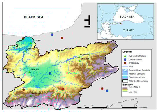 Climate Forecast System Analysis (CFSR) dataset spans the period 1979–2014. CFSR data includes daily precipitation, min-max temperatures, relative humidity, wind speed, and solar radiation data. CFSR data is obtained with coupled atmospheric, oceanic, and surface-modeling components with a resolution of ~38 km [] so that it has various spatial and temporal interpolations. Six CFSR data grids were obtained for the study area by using a bounding box: latitude 40.36–41.6 N and longitude 30.48–31.48 E.