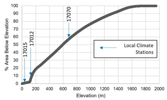 Local climate stations in the Melen Basin are located in the lower altitudes. Figure 2 shows the hypsometric curve of the Melen Basin, together with local climate stations elevation. Duzce province climate station (no: 17012) is located in the middle of the catchment at an elevation of 120 m (Figure 2). Thus, to consider orographic effects on precipitation in the mountainous areas of the Melen Basin, elevation band application was used in this study.