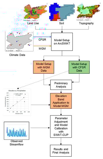 Figure 3 summarizes and shows the main workflow of the study. The model setup was conducted by using two different climate data (CFSR and local dataset) on ArcSWAT 10.3. In the following, the elevation band was applied to the local climate dataset and then model results were evaluated both statistically and visually to show the influence of elevation band application on the results. Finally, model calibration and validation were carried out with the most sensitive SWAT parameters based on the comprehensive study in the region by Cuceloglu et al. []. Moreover, model performances were evaluated for each climate dataset at each gauge stations and the water budget of the basin was given according to two different climate data.