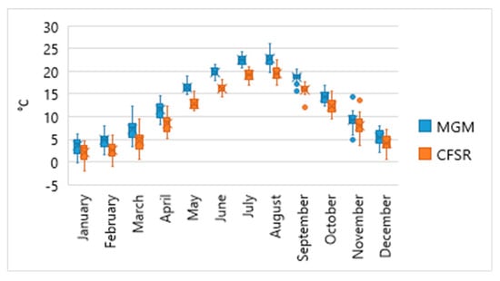 Monthly distribution of temperature for CFSR and MGM datasets.