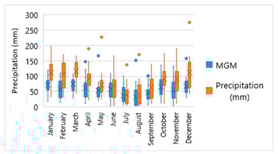 Monthly Climate Forecasting System Reanalysis (CFSR) and Turkish State Meteorological Service (MGM) precipitation distribution.