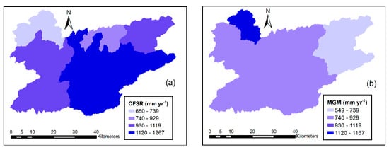 To compare the spatial distribution of the mean annual precipitation over the Melen Watershed is presented in Figure 6. While there is an agreement for temporal patterns, the spatial distribution of precipitation is quite different for both datasets. The CFSR dataset is able to produce higher rainfall over the mountainous regions. The precipitation by CFSR data ranged from 930 to 1267 mm in highlands, whereas the MGM data ranged from 549 to 929 mm. The MGM data shows 1163 mm at the outlet of the basin. The primary reason for this distribution is, the outlet of the catchment is nearby the Akcakoca station (Figure 1). As the SWAT model uses climate data from the gauge station, which is the closest to the centroid of each subbasin, precipitation value of subbasins has been obtained from the Akcakoca station. This climate station is located in the coastal zone of the Black Sea, which receives the highest amount of rainfall.
