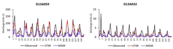 Simulated and observed streamflow for each climate dataset at stations no D13A059 and D13A032. (model results before calibration).