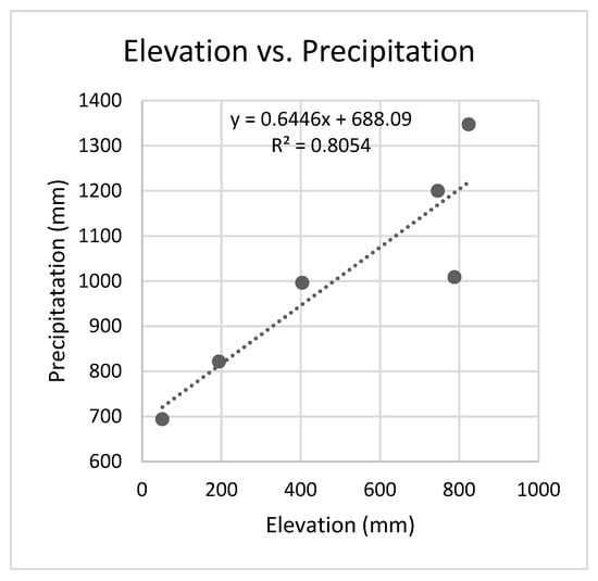 Mean annual precipitation (1995–2012) vs. elevation of the CFSR grid for the Melen Watershed.