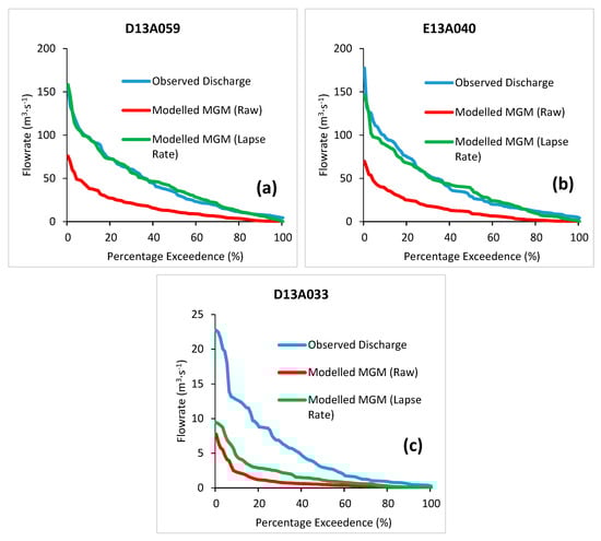 Flow duration curves (FDC) of default simulation results after application of elevation band to the local climate data. (a) Gauge station no D13A059, (b) Gauge station no E13A040, (c) Gauge station no D13A033.