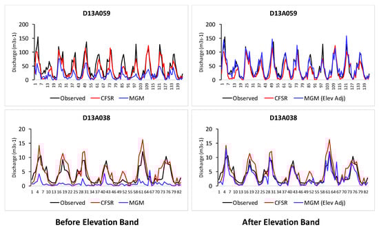 Simulated streamflow (for DA13A059 and D13A038) after the application of elevation bands using the local climate data. Hydrographs on the right-hand side shows the model results after elevation band application.
