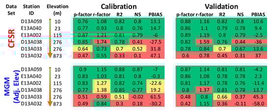 The obtained precipitation lapse rate was used to improve the simulation performance SWAT simulations by the MGM datasets. The CFSR was produced by coupled atmospheric, oceanic, and surface-modeling component so that this reanalysis data already contains an elevation gradient for the meteorological parameters []. Thus, we did not apply precipitation lapse adjustment to the SWAT simulations conducted by CFSR data.