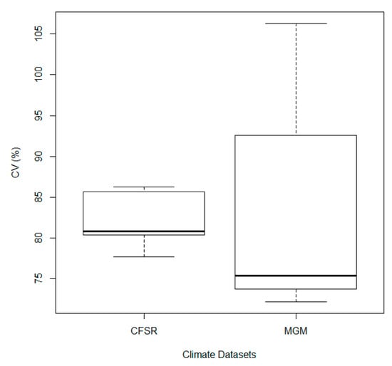To investigate the variability in the streamflow simulations, the coefficient variation (CV = σ/μ × 100) was calculated, where σ is the standard deviation and μ is the mean of the streamflow. CV was calculated for the simulation period in each gauge station. CV values for gauge stations range between 77% and 86% for the CFSR dataset, whereas it varies between 73–107% for the local climate datasets. To demonstrate the variability of model predictions, a boxplot of CV values of all gauge stations is plotted (Figure 12). We used exactly the same spatial data (land use, soil) and model setup (number of subbasin and hrus) therefore, the variability of the coefficient of variation was stemmed from both parameters and climate. Since we used the same parameter interval in the SUFI-2 algorithm, variability in our model result was mainly caused by climate datasets. After model calibration, streamflow predictions with the local climate datasets showed larger variability than the model driven by CFSR.