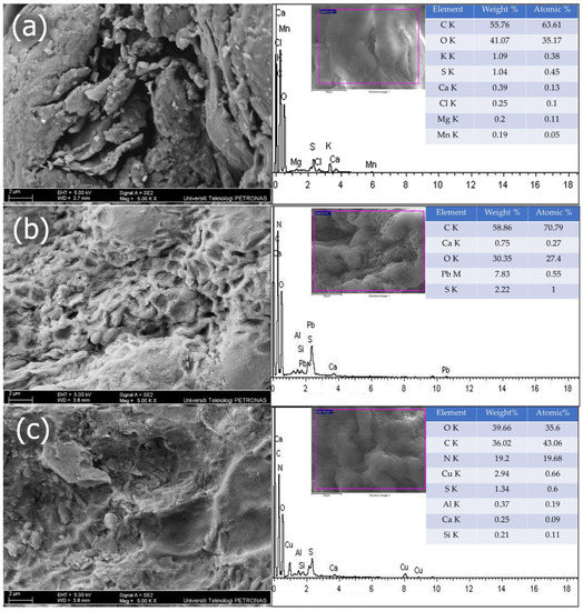 Field-emission scanning electron microscopy (FESEM) images (left) and energy-dispersive X-ray (EDX) spectrums (right) for (a) unloaded biomass, (b) Pb(II)-loaded biomass, and (c) Cu(II)-loaded biomass.