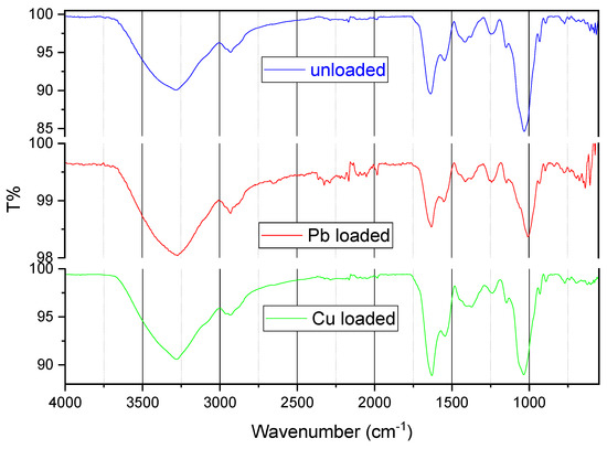 The functional groups on the biosorbent surface and their interaction during the biosorption process of Pb(II) and Cu(II) were investigated through FTIR spectrum analysis. Figure 2 shows the peaks corresponding to the functional groups of red algae before and after the biosorption of metal ions. The broad and strong peak at 3281.88 cm−1 was assigned to the overlapping of O–H and N–H stretching, indicating the existence of hydroxy stretching and carboxylic groups on the surface on algae [22,49]. The peak at 2928.35 cm−1 was attributed to the C–H stretching vibration of aliphatic groups [6,50]. The peaks at 1636.14 and 1545.21 cm−1 represented the presence of C=C stretching [51]. The peak found at 1413.01 cm−1 was assigned to the C–H bonding [50]. The peaks observed at 1243.88 cm−1 was attributed to the C–O stretching [45]. The sulfoxide band was assigned to the peak observed at 1030.15 cm−1 [52,53]. The numerous characteristic peaks observed on the surface indicate the complex nature of the biosorbent. The changes in vibration peaks are summarised in Table 3. The changes in the vibrational frequency of the functional groups after the biosorption of Pb(II) and Cu(II) indicated the involvement of these groups in the biosorption [6,54]. The difference in ion biosorption can be attributed to the different ions’ affinity to for the functional groups [45].