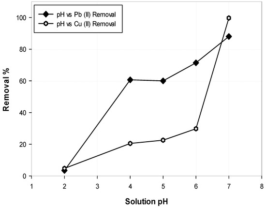 Pb(II) and Cu(II) removal percentage against solution pH.