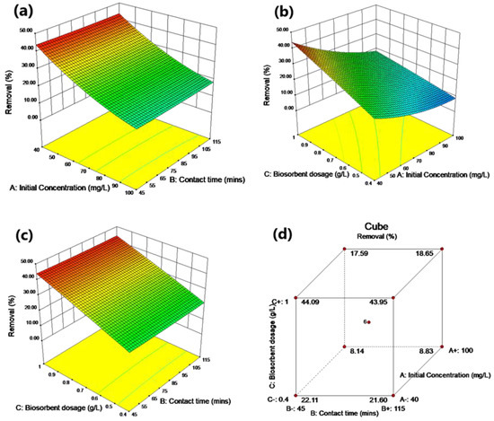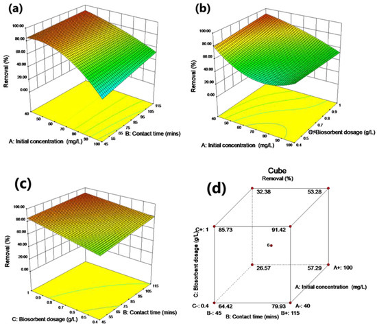 Combined effect of process variables (a) initial concentration and contact time, (b) initial concentration and biosorbent dosage, (c) contact time and biosorbent dosage on Cu(II) removal with interaction effect of dual factors, (d) removal percentage at each factorial point.