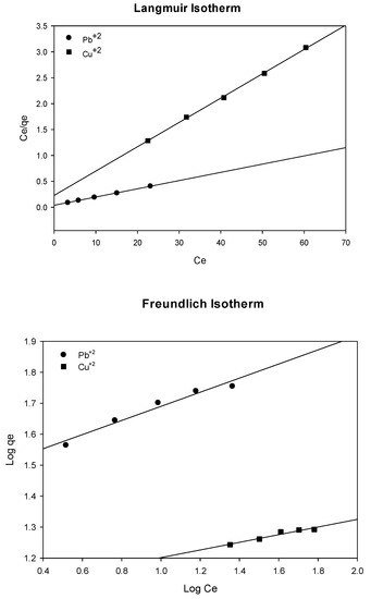 The sorption equilibrium data were tested with the Langmuir and Freundlich isotherms. The model parameters for each isotherm and their respected correlation coefficients (R2) are shown in Table 8. Figure 7 illustrates the Freundlich and Langmuir adsorption isotherms of ions on the biosorbent. The Langmuir isotherm best fitted for Pb(II) and Cu(II) on the red algae, with R2 greater than 0.99. This fitting indicated that the sorption of both metal ions had a mono layer coverage on the sorbent surface [54]. The maximum sorption capacity was higher for Pb(II) than that for Cu(II). The KL value of Pb(II) was higher than that of Cu(II), indicating the higher affinity of the former to the bonding sites on the alga surface. The values of RL were 0.056 and 0.108, confirming the favourable sorption of Pb(II) and Cu(II) onto the alga biomass [70].