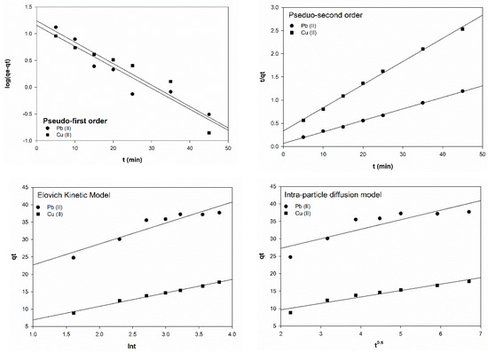 Linear fitting of biosorption of Pb(II) and Cu(II) by G. changii to the pseudo-first order, pseudo-second order, and Elovich and intra-particle diffusion kinetic models.