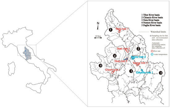 The water bodies of Central and Southern Italy are particularly threatened by climate change. Flow rates of the Apennine chain watercourses are closely linked to atmospheric precipitations. Climate models predict an exacerbation of their torrential characteristics, with an intensification of extreme meteorological phenomena and reduced flow rates in the summer season [9]. This situation is further aggravated by increases in water withdrawals for irrigation purposes [25,26]. The Tiber River basin (Central Italy) is characterized by the presence of a large number of endemic fish species with limited areal distribution which are, therefore, highly vulnerable to extinction [27,28]. In fact, the loss of flow occurring in the Tiber River basin during periods of drought can lead to the isolation of endemic species with limited thermal tolerance. Three species in particular are subject to the potential effects of climate change in this area: the Etruscan chub Squalius lucumonis (Bianco 1983), the Italian riffle dace Telestes muticellus (Bonaparte, 1837), and the Arno goby Padogobius nigricans (Canestrini, 1867). Squalius lucumonis is an endemic species with a distribution limited to three river basins in Central Italy [29,30]; the species is listed as endangered on the International Union for Conservation of Nature (IUCN) red list of threatened species [31], and the progressive reduction of the species range is due to habitat alterations and water withdrawals [30]. Telestes muticellus is endemic to Northern and Central Italy; it prefers moderately cool waters in upper stream reaches [32]. Padogobius nigricans is a species endemic to Central Italy. It is listed as vulnerable in the IUCN red list of threatened species [31] because it is threatened by habitat alterations and competition with the Padanian goby Padogobius bonelli (Bonaparte, 1846) [33,34], a species endemic to Northern Italy introduced in the Tiber river basin in 1993 [35]. These three species inhabit small watercourses in the upper part of the Tiber basin, which represent refuge areas in comparison with downstream reaches and lowland rivers, which are compromised by the combined action of water pollution and presence of many exotic species [23]. However, these refuge areas have marked torrential features and are subject to drought periods during the dry seasons. Currently there is scarce information in the literature on the thermal niche of the three species; however many studies showed their reophilic characteristics and their location in the middle-upper section of the rivers, where current speed and dissolved oxygen are quite high and water is mildly cool [27,28,29]. Among all the fish species occurring in the study area with limited thermal tolerance, P. nigricans, T. muticellus and S. lucumonis seemed to be particularly suitable for evaluating the fish distribution shifts in freshwater ecosystems, since they are not a target for sport fishing, and they are not subject to stocking activities.