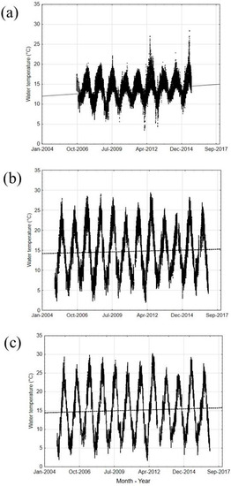 Trend over time of water temperature for 3 automatic monitoring stations: Clitunno River 1 (a), Topino River 2 (b), Tiber River 3 (c). Time periods: 2006–2015 for Clitunno River; 2006–2015 for Topino and Tiber Rivers.