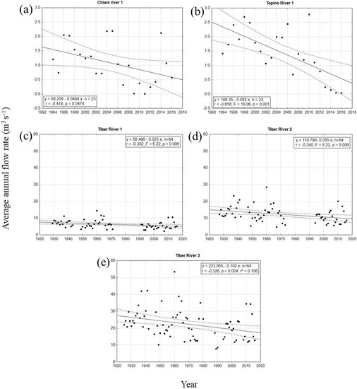 The annual average flow rates showed a clear decreasing trend over time in the Chiani and Topino rivers than for the Tiber River. In both cases, the time series of data available (years 1992–2016) was shorter than the Tiber River (years 1920–2016) (Figure 3). All relationships resulted as statistically significant at the ANOVA analysis (p < 0.05); the regression coefficients resulted statistically significant at the t-test analysis (p < 0.05).