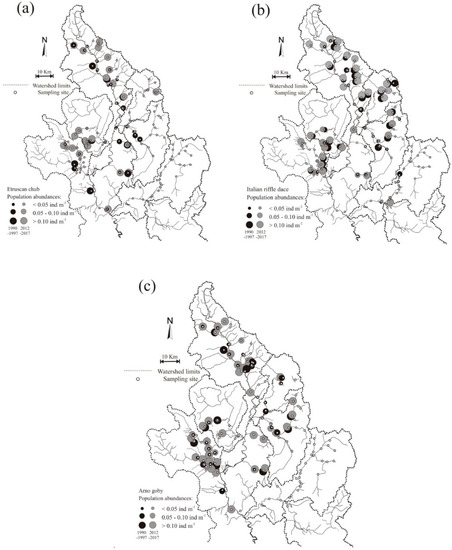 Comparison of the distribution and population abundances between the periods 1990–1997 (black circles) and 2012–2017 (grey circles) for: (a) Squalius lucumonis; (b) Telestes muticellus; (c) Padogobius nigricans.