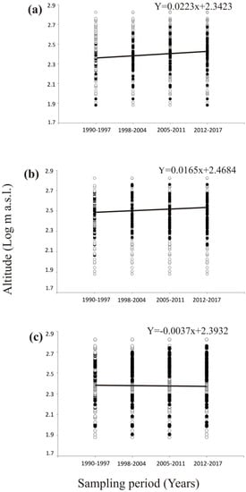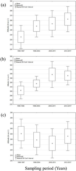 Trend over time of the mean altitude values for: (a) Squalius lucumonis, (b) Telestes muticellus and (c) Padogobius nigricans considering only the occurring sites in the census periods 1990–1997, 1998–2004, 2005–2011, 2012–2017.