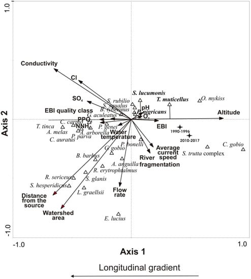 Similarly to previous studies [28,45], our CCA demonstrates how the fish species are distributed along the longitudinal gradient of the watercourses and which are the environmental variables that most influence their distribution. As reported for other watersheds in the Mediterranean area [70], also in the Tiber River basin the longitudinal gradient was associated with a progressive decline in water quality, proceeding from upstream to downstream, demonstrated by the decrease of EBI and increased conductivity and concentration of dissolved salts. Beside this, recent studies carried out in the Tiber river basin [28,71] showed the presence of many invasive species, mainly located in lowland stream reaches and lakes [72,73]; these species are often limnophilous and can be favored by climate changes due to their wider ecological tolerance.