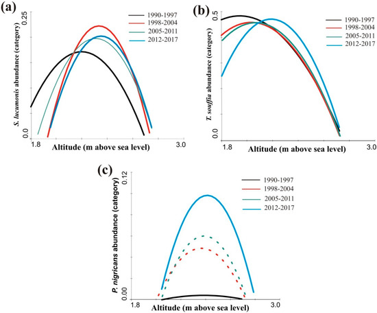 The effects of altitude on the abundance of (a) Squalius lucumonis, (b) Telestes muticellus and (c) Padogobius nigricans over the census periods 1990–1997, 1998–2004, 2005–2011, 2012–2017. Solid lines indicate significant results from the general linear model (GLM).