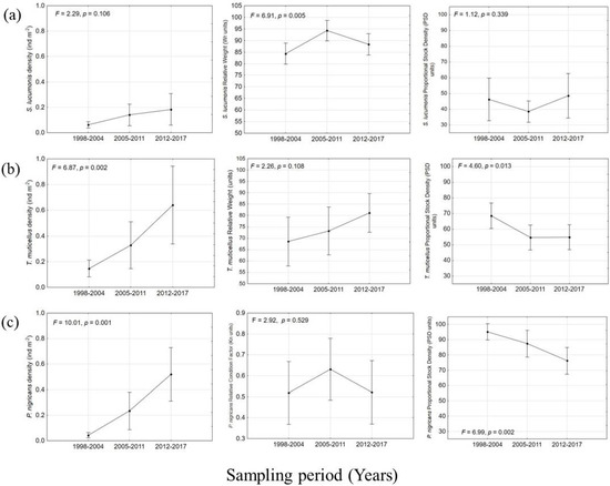 Population density increased over time for all three species; except for S. lucumonis (Figure 10a), for the other species repeated measures ANOVA showed highly significant differences between periods (p < 0.01) (Figure 10b,c). As regards the body condition trend over time, the differences between periods were statistically significant at the repeated measures ANOVA only for S. lucumonis (p = 0.005), even if the mean values resulted in always being below the lower limit of the optimal range 95–105 (Figure 10a). The differences over time of mean PSD values resulted significant for T. muticellus (p = 0.013), with the average values calculated for the periods 2005–2010 and 2011–2017 falling within the optimal range of 35–65. In the case of P. nigricans, the results of repeated measures ANOVA revealed a significant, progressive decrease in average values over time (p = 0.002), with the PSD values consistently above the optimal range, indicating the lack of young specimens in the sample (Figure 10c).