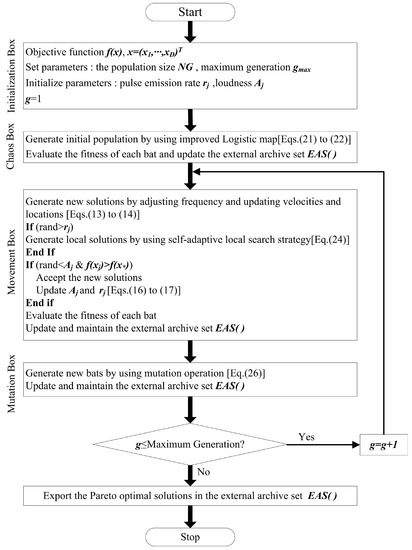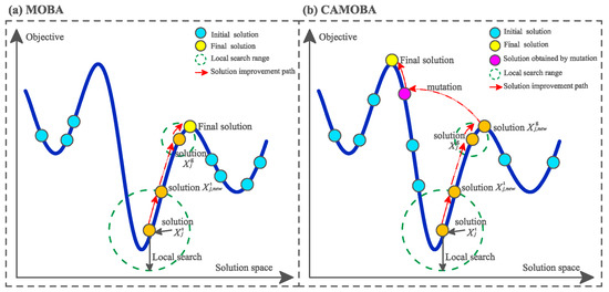 Sketch map of optimization processes: (a) Multi-objective bat algorithm (MOBA); and (b) chaotic adaptive multi-objective bat algorithm (CAMOBA).
