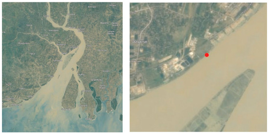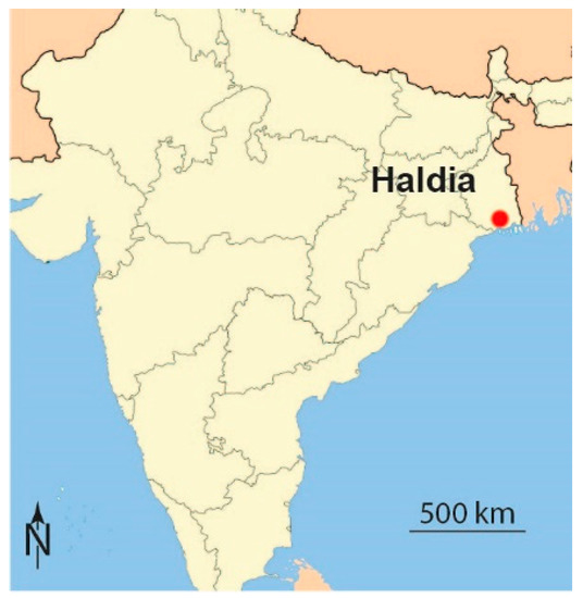 For this study, a coastal stretch in India was selected, in the state of West Bengal, just north of the Port of Haldia. More precisely, along the India Exchange Place Road (22°3′59″ N; 88°9′24″ E), see Figure 2 and Figure 3. At this specific location, a sea dike was constructed at a location where a mangrove belt had disappeared.