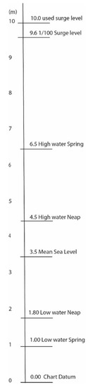 During cyclone events, the water level will rise considerably. In 2013, Rao [8] presented a prediction for the coast of India for the present sea level and for a rising sea level. In the calculation in this paper, sea-level rise is not included. According to Rao, the present 1/100 year water level in West Bengal is 9.6 m above Chart Datum. This is confirmed by [9]. Because of the funnel-effect of the Hooghly River, for this computational example, a somewhat higher water level was used: 10 m above Chart Datum.