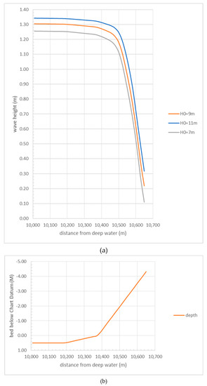 Wave height computation for three different wave heights (a) and the water depth at the same location (b).