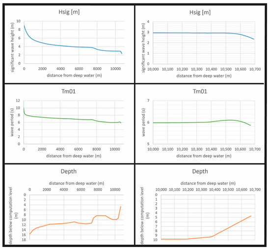 As can be seen, the wave height decreases fast because of the shallowness of the water. Waves will just pass the Char, but will be broken. At a water depth of 3 m (this is 3 m above Chart Datum), the wave height is 1.2 m and the wave period is reduced to somewhat more than 4 s. Figure 7 shows that the original deep water wave height is not very influential, near the coastline the difference is only in the order of 10 cm.
