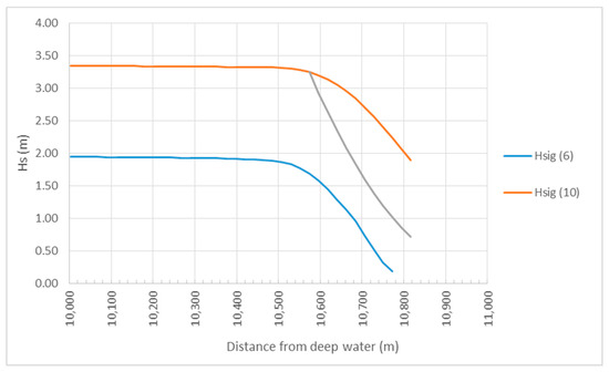 Wave height near the coastline for a surge of 6 and 10 m.