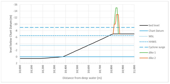 The sea defence dike has to be designed in such a way that during design conditions, the amount of overtopping is limited. When there is too much overtopping, the inner slope will start to erode, which eventually will lead to a breach in the dike. For classical design of dikes, a dike is sufficiently safe when less than 2% of the waves will overtop the dike. The computations were carried out according to the EurOtop Manual [13]. A slope (both outer and inner slope) of 1:3 was applied, because experience has shown that with such rather gentle slopes, one will not have problems with geotechnical stability. More gentle slopes usually give a higher ecological benefit but are more costly because of their land use. The height of the dike can be reduced by constructing a berm on design water level (in this case the 10 m cyclone level). A computation is made for a case without a berm (dike 1) and a case with a 10 m berm (dike 2). The results show that the dike with berm is lower and has a smaller volume than the dike without a berm. Usually there is a road on top of the dike, but the cost and effects of such a road are not included in this analysis, because they are the same for all options analysed. The result is shown in Figure 12 (note that in Figure 12 and Figure 13 for the vertical axis depth is positive, so values above Chart Datum are negative). The actual computations can be found in the spreadsheet in the Supplementary Material.