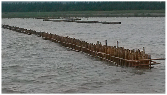 Because seedlings cannot survive significant wave action, a temporary wave barrier has to be constructed (see example in Figure 14). This can be a simple bamboo screen, as is used in many places of the world. Such a screen can be built by a crew of five men, they make approximately 10 m per day, so including the materials this will cost in the order of INR 1000 per running meter of dike.